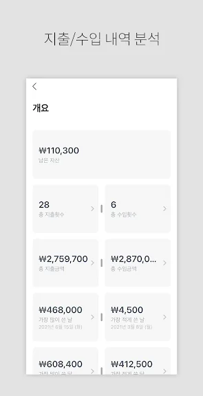 가장많이 쓴날, 가장많이 쓴달, 가장적게 쓴날, 가장적게 쓴달 등, 다양한 통계 제공과, 누적 지출/수입 내역 및 남은 자산 표시