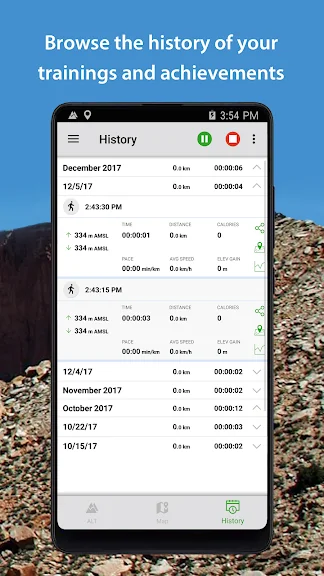 - 속도, 평균 속도, 고도 증가 지표와 함께 지도상의 경로를 기억하는 히스토리 기능과 높이 차이 그래프[앱이 닫혀 있을 때도 작동].