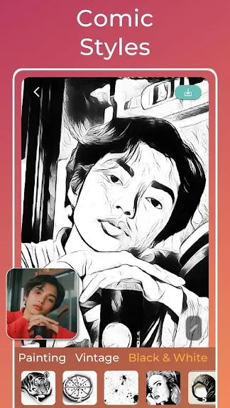 - 많은 만화 및 스케치 효과 중에서 선택하고 설정을 조정하여 사진의 무한 변형을 만들 수 있습니다.