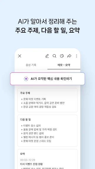 자동 추출된 요약/주요 주제/다음 할 일은 편집도 가능해요.
