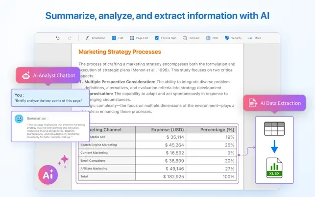• Analyze and extract key information or tables from a PDF, then convert the data into spreadsheets for further analysis or visualization.