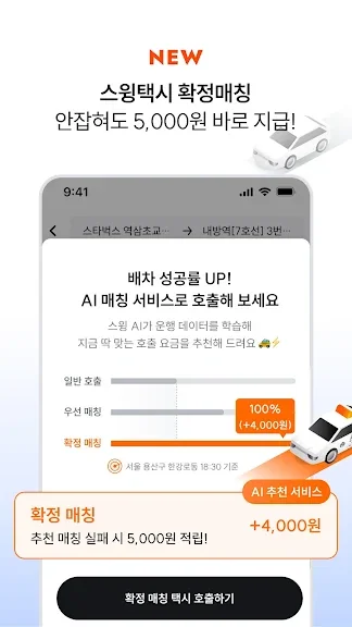 · 스윙 AI가 택시 운행 데이터를 분석하여 최적의 호출 요금을 추천! 이제 택시가 필요한 순간, 확정매칭과 우선매칭 서비스로 즉시 호출하세요.