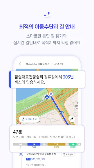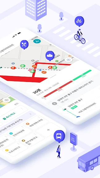 - 대중교통, 공유 자전거, 전동 킥보드, 도보 등 이동수단을 검색하고, 단일 또는 결합된 최적의 경로를 제공해요.
