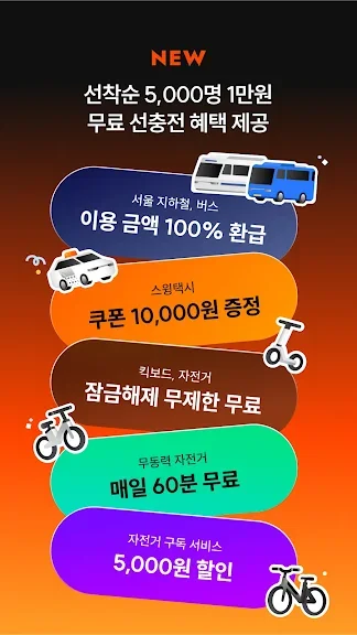 · 대중교통비 100% 무제한 환급 + 이용 횟수당 100원 마일리지 적립! 매달 최대 5,000원 적립받아 스윙 이용 시 할인 혜택을 누리세요.