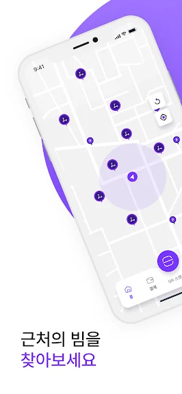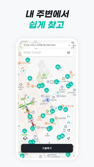 1. 앱을 실행하여 주변의 가까운 씽씽 전동킥보드를 찾습니다.