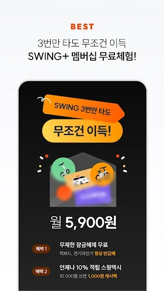 · 스윙플러스 베이직 (월 4,900원): 킥보드·전기자전거 10분당 1,000원! 횟수 제한 없이 최저가 라이딩 가능해 짧고 자주 타는 라이더에게 강력 추천해요.