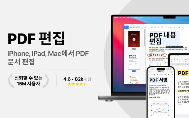 • PDF 편집: 텍스트, 이미지, 도형, 하이라이트, 주석, 밑줄, 취소선을 추가합니다. 이미지를 원본 형식으로 저장하고 기존 이미지를 제거할 수 있습니다.