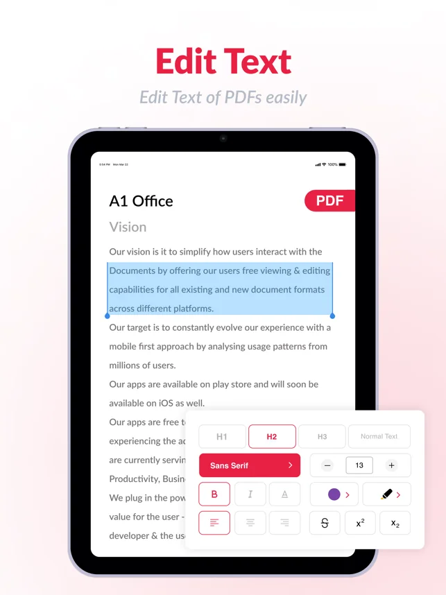 A1 PDF Editor는 iOS 장치를 완벽한 기능을 갖춘 오피스 제품군으로 바꿔주는 강력한 모바일 앱입니다. 광범위한 기능 세트를 사용하면 어디서나 PDF 문서를 무제한으로 편집, 전자 서명 및 관리할 수 있습니다. A1 PDF Editor를 사용해 작업 방식을 어떻게 혁신할 수 있는지 알아보세요.