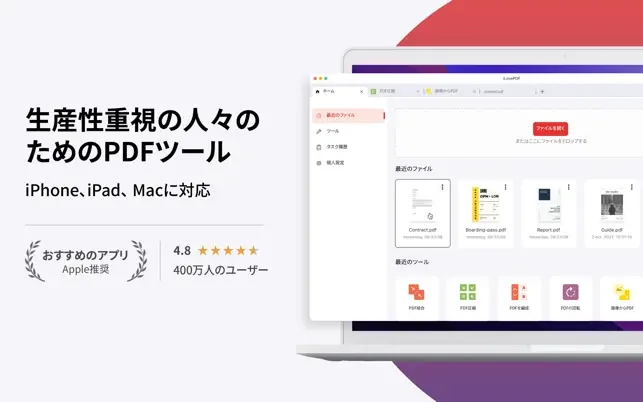 macOS용 iLovePDF를 다운로드하여 PDF 파일을 쉽게 관리, 최적화, 편집하세요. iLovePDF 온라인 서비스의 모든 기능을 통해 컴퓨터에서 오프라인 및 로컬로 파일을 처리하여 속도와 개인 정보를 최대한 보호할 수 있습니다.