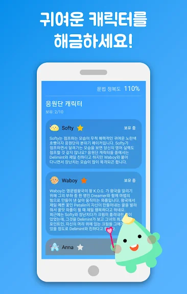 각 토픽(항목)마다 퀴즈가 준비되어 있습니다. 퀴즈를 풀고 문법 정복도라는 점수를 올려서 다양한 캐릭터를 해금해 보세요!