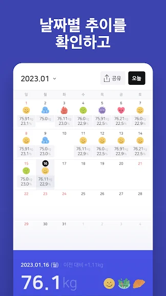 - 내 몸무게 캘린더를 트레이너나 주변 사람에게 공유할 수 있어요.