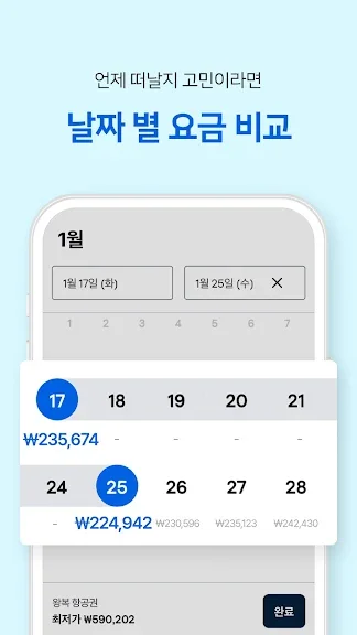 달력 화면에서 날짜별 최저 요금을 비교해 가장 싸게 떠나는 날을 잡을 수 있습니다. 가격 알림을 켜 두면 요금 변동 시 즉시 알려 드려서 특가를 놓치지 않습니다.
