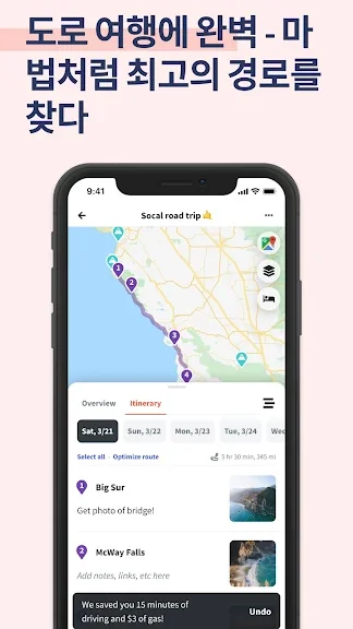 - 📍로드트립 계획 시 무료로 무제한 중지 추가, 루트 최적화로 장소 간 시간 및 거리 확인, Google 지도로 장소 내보내기