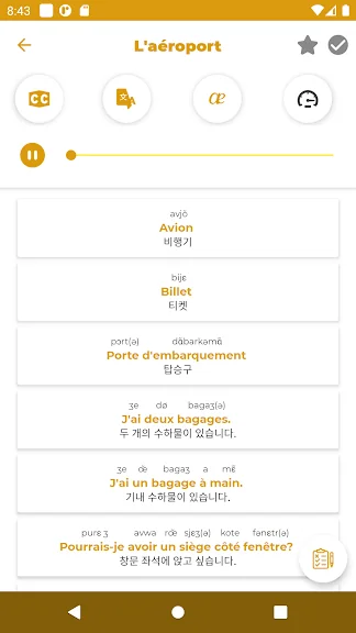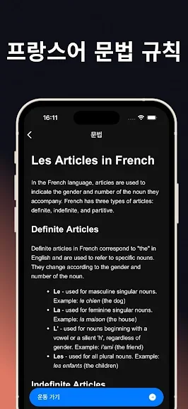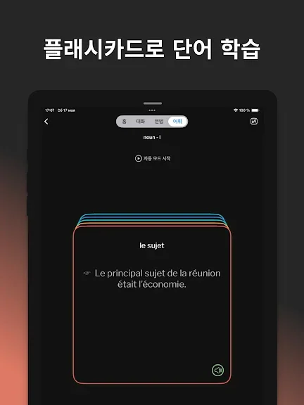 우리의 단계별 학습 과정은 사용자가 프랑스어를 더 잘 이해할 수 있도록 설계되었습니다. 단어를 터치하면 그 의미를 배울 수 있고, 즉시 어휘력을 확장할 수 있습니다.