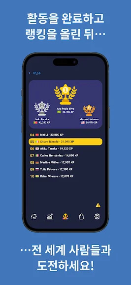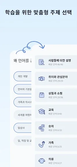 매일 제한 없이 자신의 시간에 자기만의 속도로 공부하세요. 읽기, 쓰기, 듣기 또는 어휘 학습을 선택하세요. 모든 것이 사용하기 쉽고 개인화되어 있습니다.