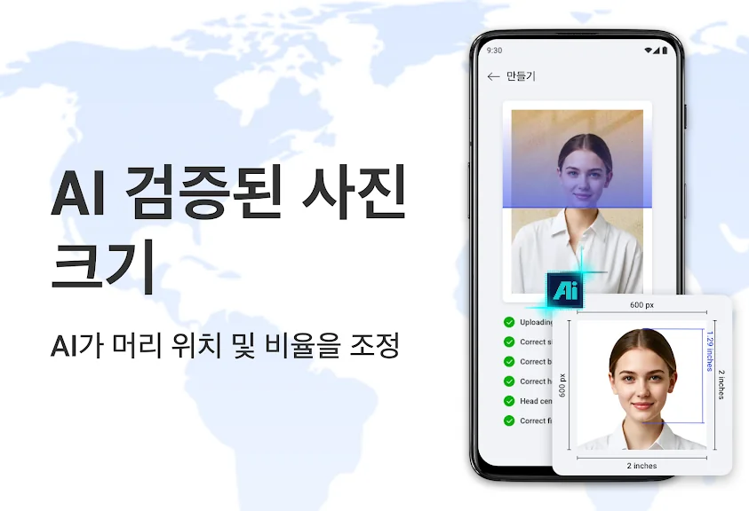 ✔ AI 규격 검사 – 여권 사진이 모든 공식 요구 사항을 충족하는지 확인합니다.