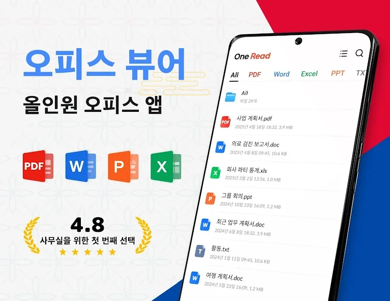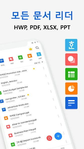'모든 문서 리더'를 사용해 보세요! 이 올인원 파일 뷰어는 모든 Office 파일과 호환되며, PDF, DOC, DOCX, XLS, XLXS, PPT, TXT 등 모든 형식의 파일을 간편하게 처리할 수 있습니다. 휴대폰에 있는 파일을 자동으로 스캔하고, 한 곳의 해당 폴더에 정리함으로써 편리하게 검색하고 열람할 수 있습니다.