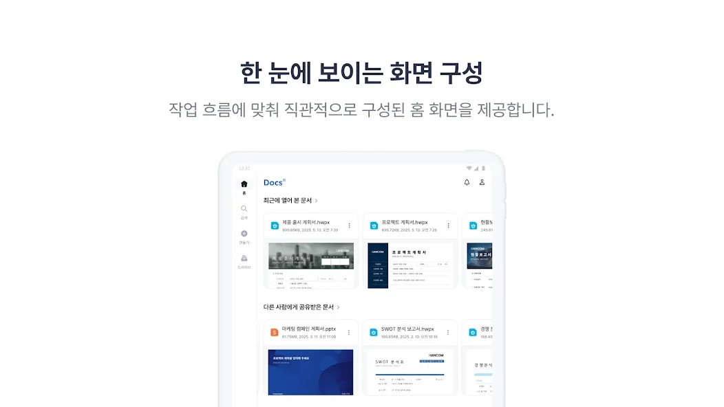 한컴독스는 다양한 모바일 기기에서 한글(hwp, hwpx) 및 워드, 엑셀 및 파워포인트 문서를 편리하게 확인하고 쉽게 편집할 수 있어요.